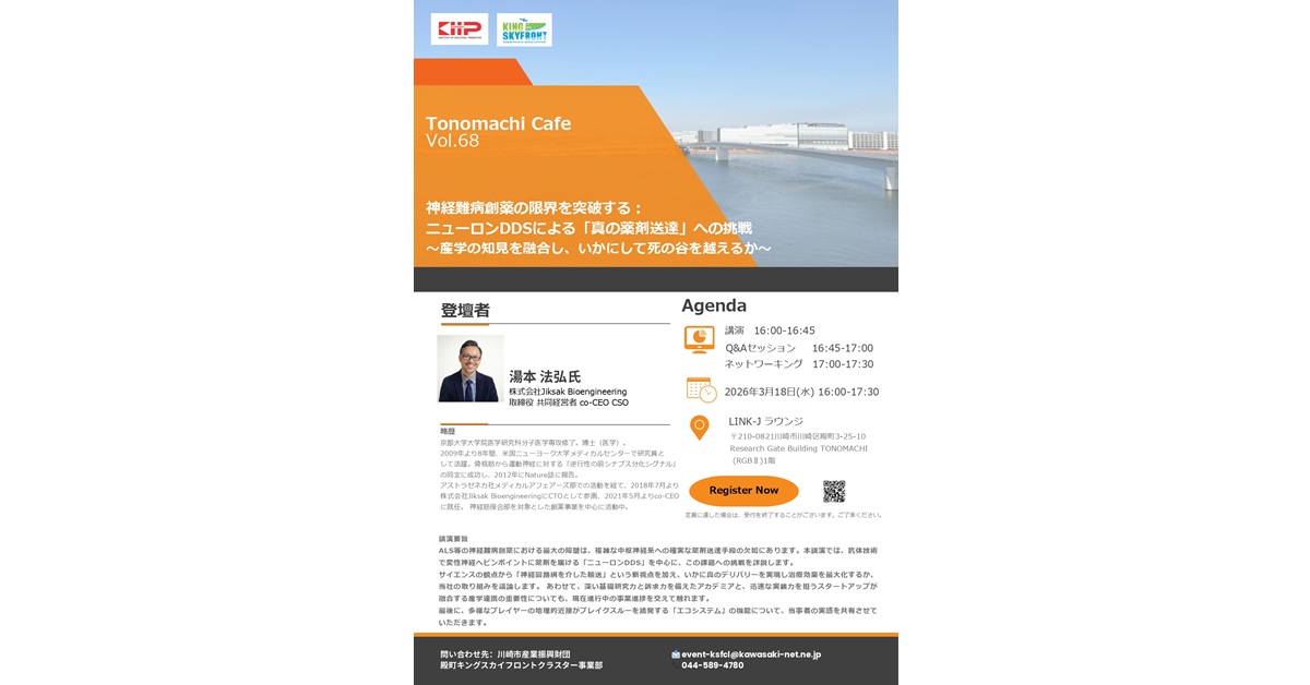 第68回Tonomachi Cafe 神経難病創薬の限界を突破する:ニューロンDDSによる「真の薬剤送達」への挑戦 〜産学の知見を融合し、いかにして死の谷を越えるか〜